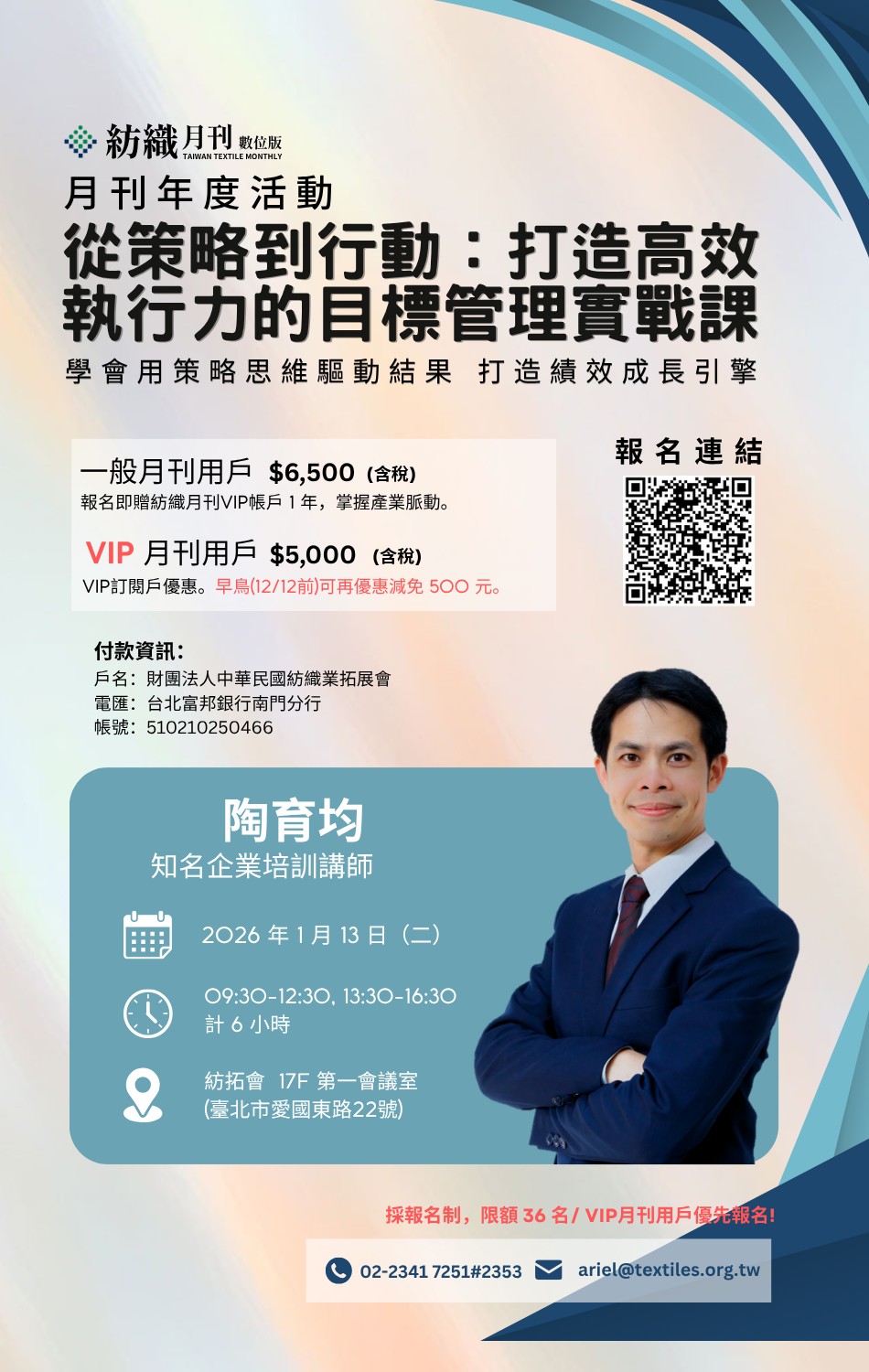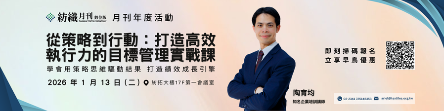 在瞬息萬變的全球紡織產業,訂單、產地、生產模式快速調整,永續規範愈趨嚴謹,企業最大的挑戰已不再是制定策略,而是如何讓策略真正牽動每日的行動與績效? 身為紡織月刊的用戶與VIP 先進,我們深知您的每一分鐘都值得最有效的投入。 因此,為您精心策劃這場年度專屬的【從策略到行動:打造高效執行力的目標管理實戰】課程,助您將目標管理從冰冷的「制度」,升級為驅動團隊前進的「績效引擎」。