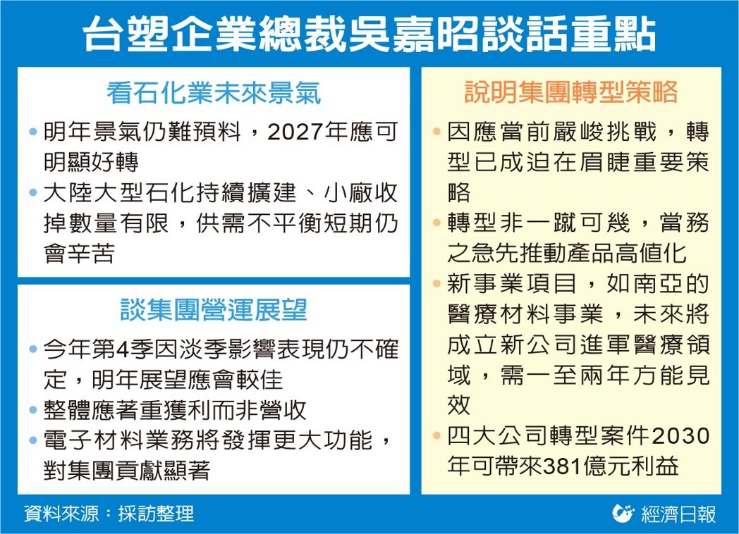 談及轉型進度,吳嘉昭說,他自一年多前接任台塑集團轉型召集人以來,深知轉型非一蹴可幾,當務之急是先推動產品高值化,這部分能立竿見影;至於新事業項目,如南亞的醫療材料事業,未來將成立新公司進軍醫療領域,但需時一至兩年方能見效。