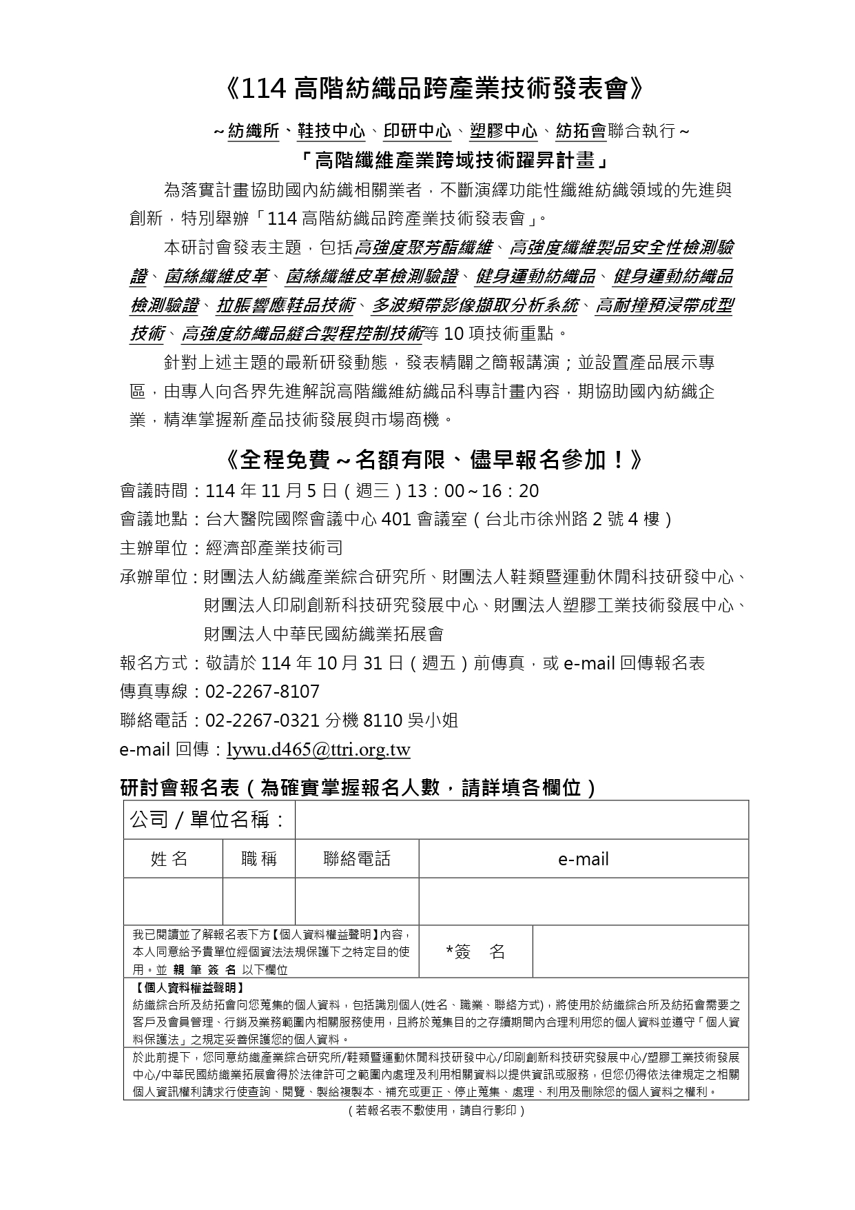 報名表下載:「114高階紡織品跨產業技術發表會」報名表
