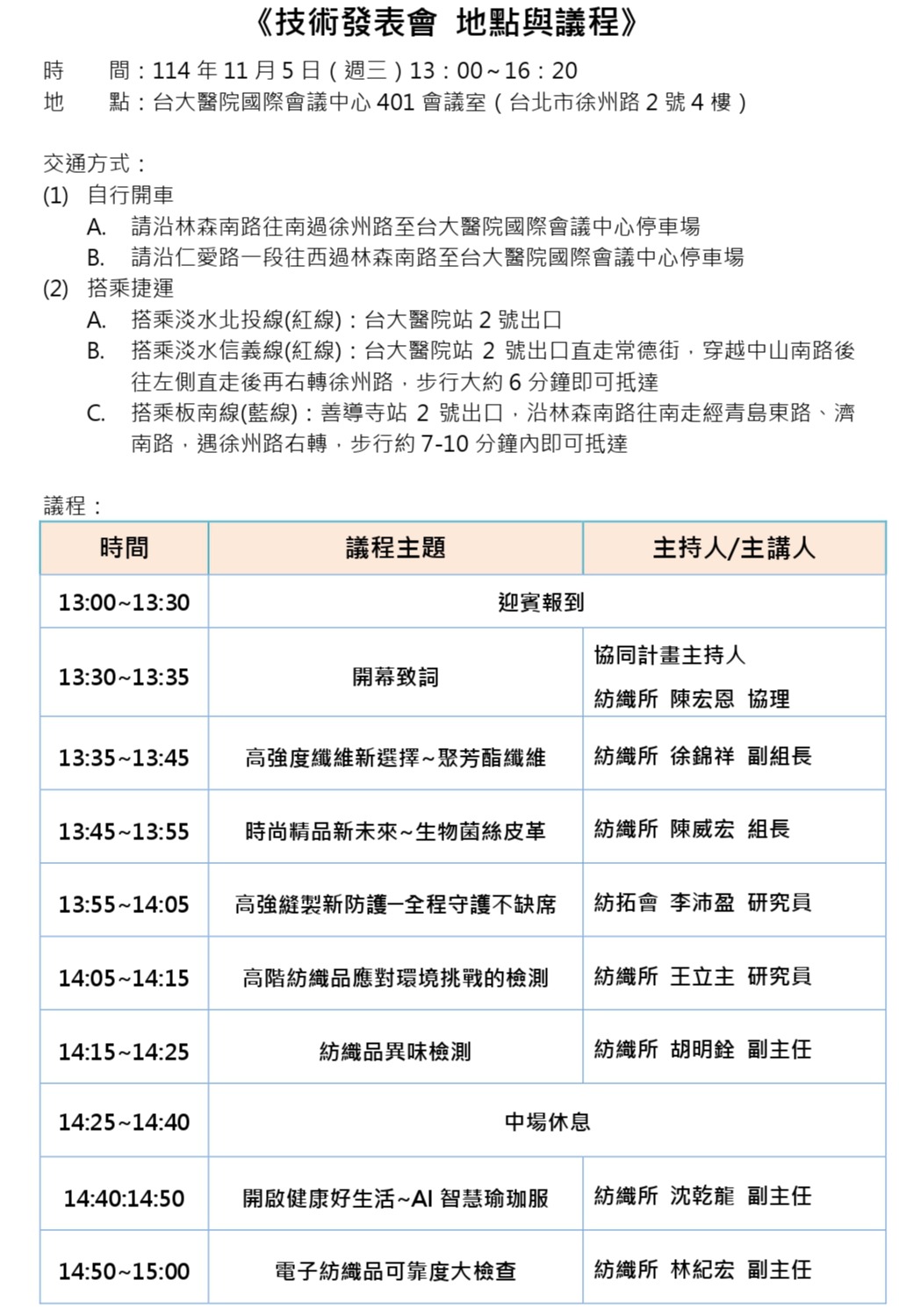敬邀11月5日由經濟部產業技術司 舉辦114 高階紡織品跨產業技術發表會